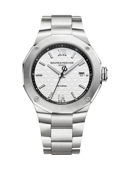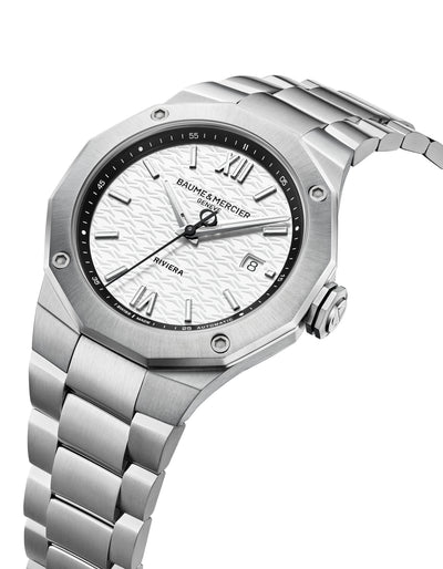 The Riviera 10829 is distinguished by a black and white contrast that is both bold and harmonious. Its white dial with a wave decor is highlighted by a black bevel. The riveted Roman numerlas, indexes, and faceted rhodium-plated hands are coated with white Superluminova. The black seconds hand with Phi logo on the counterweight accentuate this two-tone design. It is equipped with an automatic SW200 movement with a 38-hour power reserve and water resistance to 10 ATM. The interchangeable stainless-steel bracelet features a reliable system for tool-free changes.
