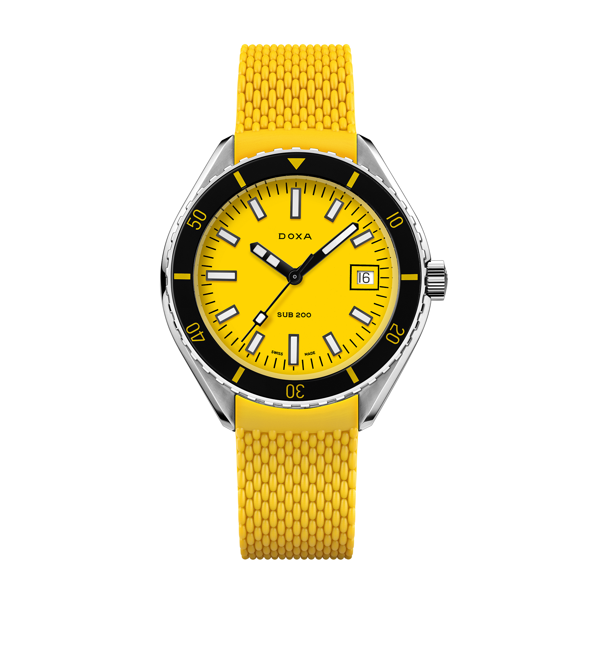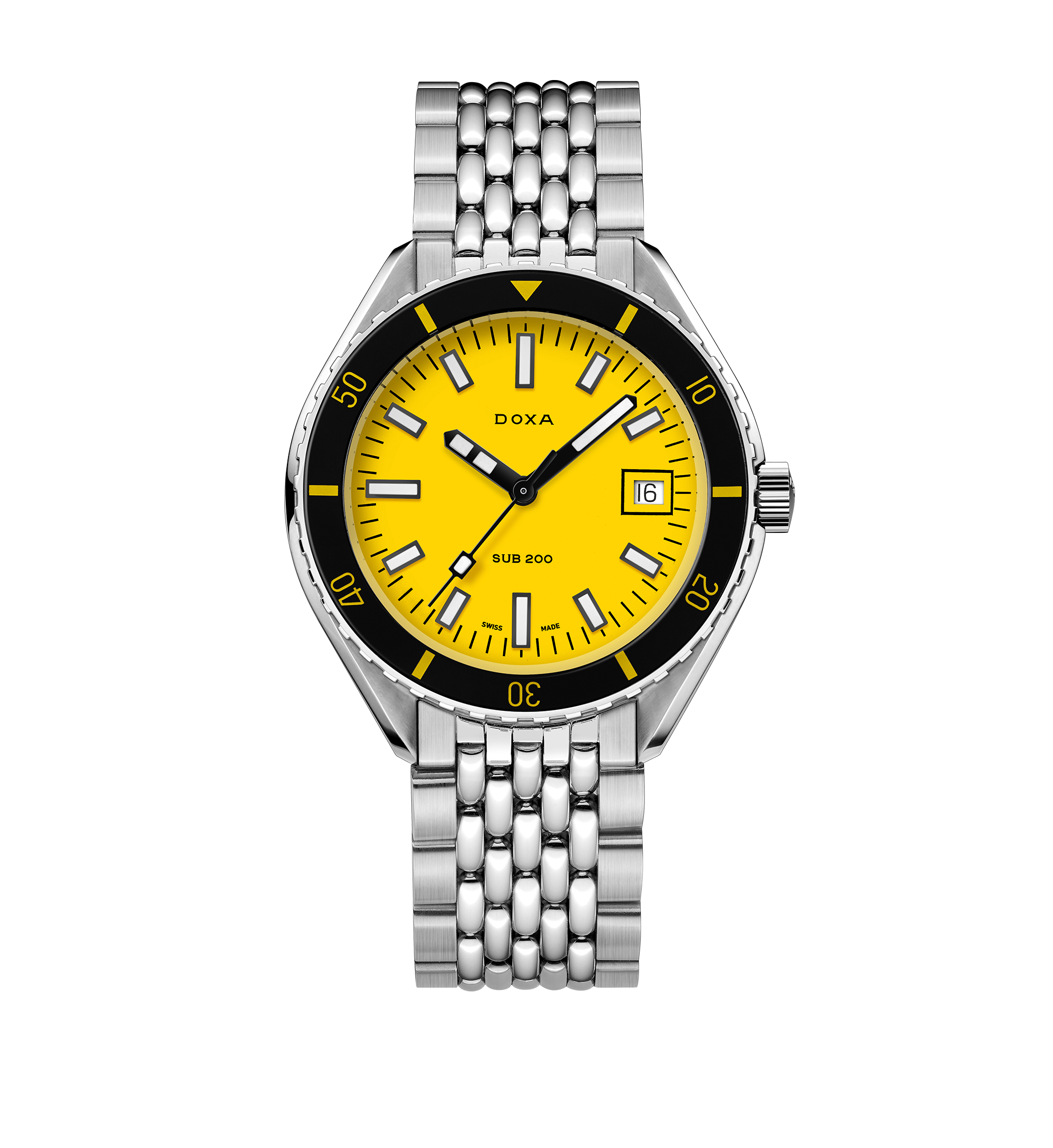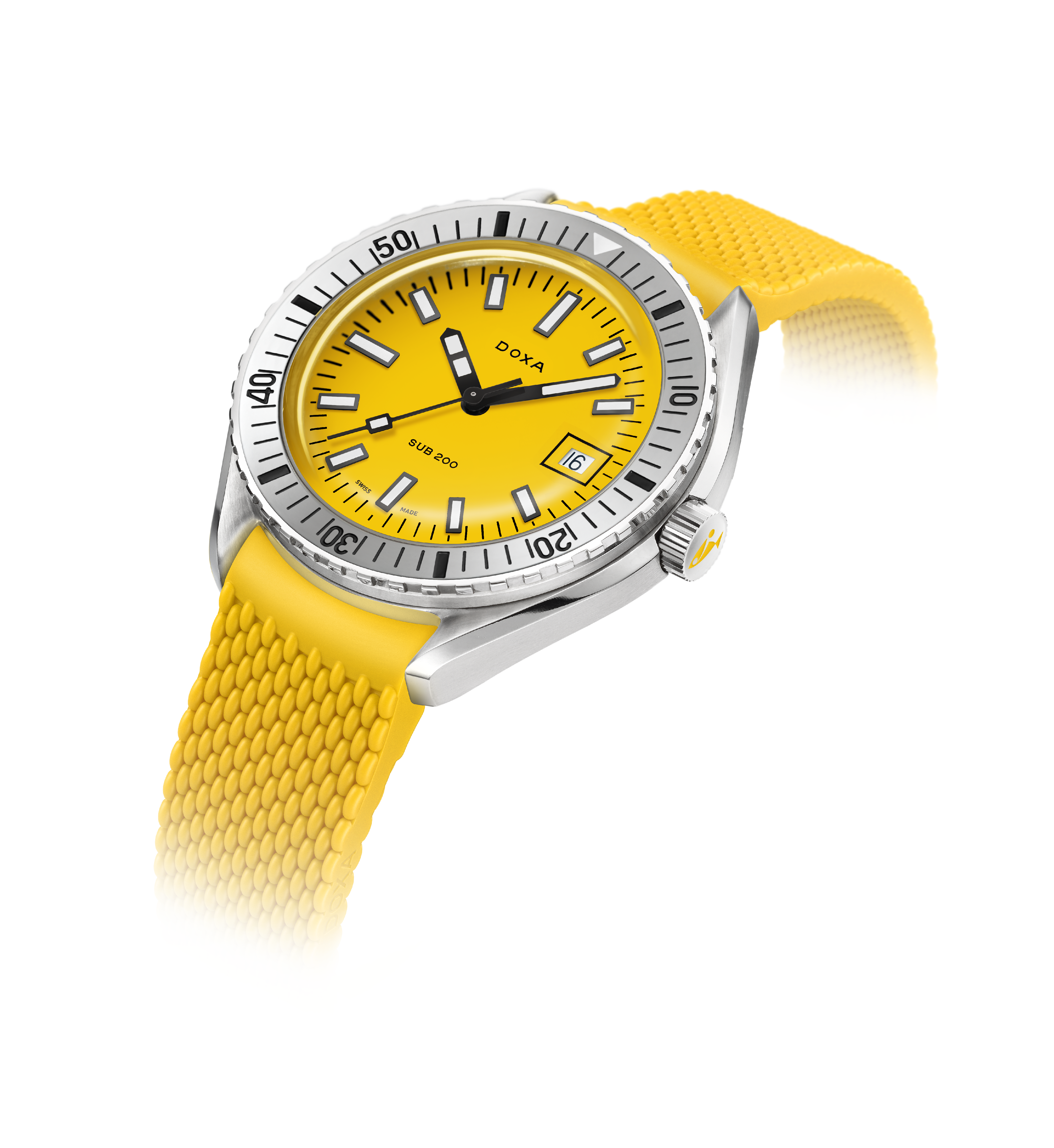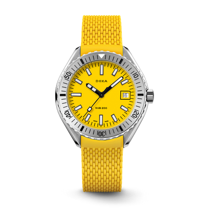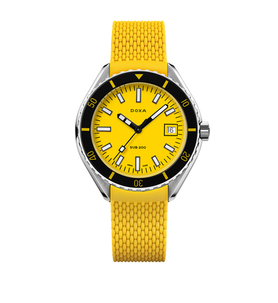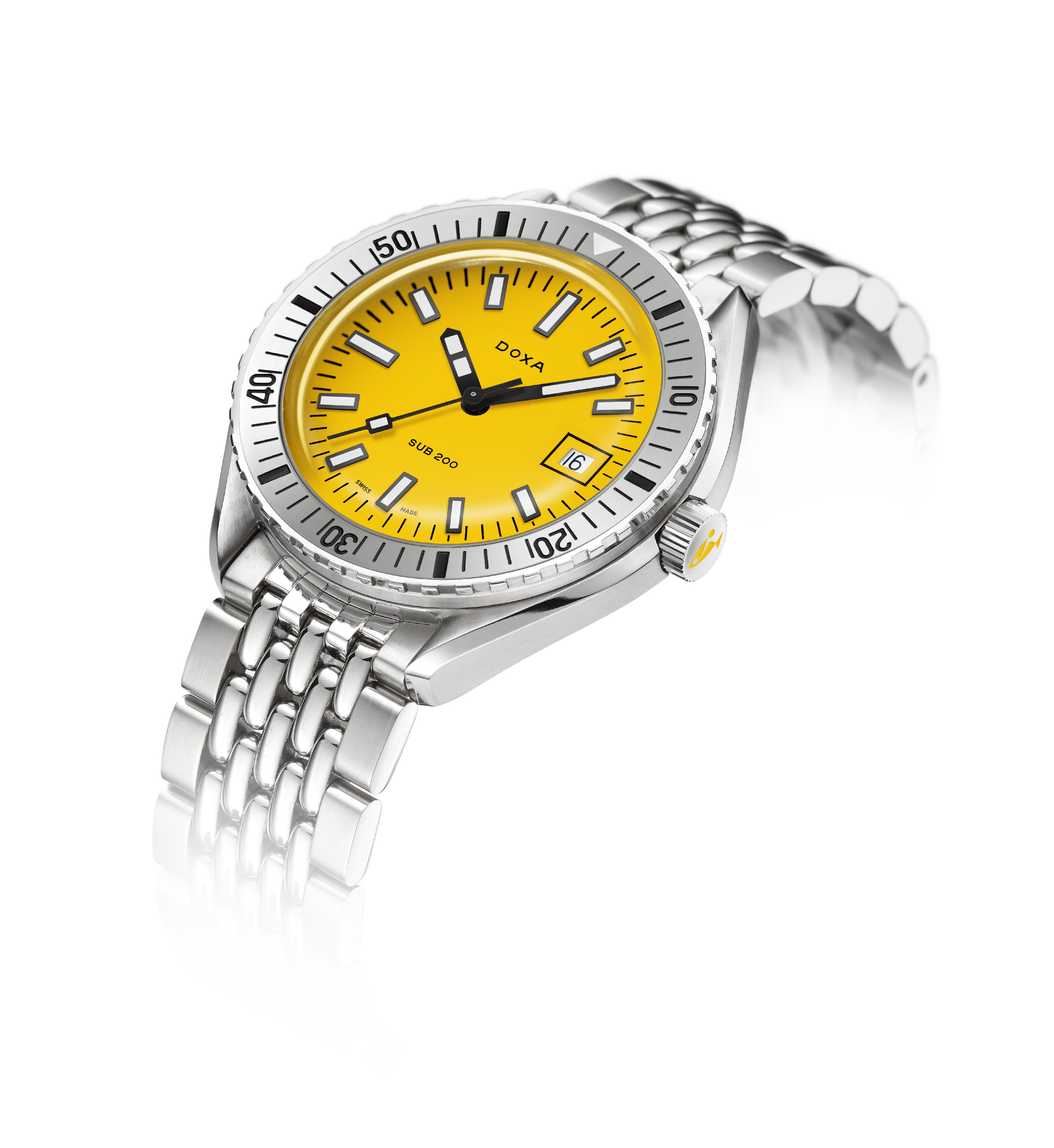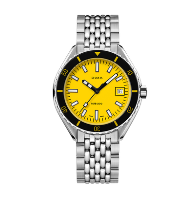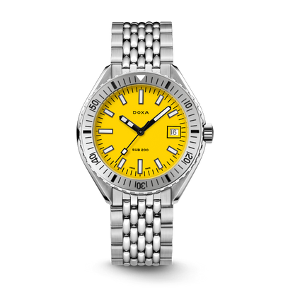 Dévoilée lors du salon Baselworld 2019, cette montre de plongée à trois aiguilles est dotée d'un boîtier en acier inoxydable 316L de la plus haute qualité. D'un diamètre de 42 mm, la SUB 200 est surmontée d'un verre saphir résistant aux rayures avec un revêtement antireflet et la courbure distinctive du plexiglas bombé utilisé autrefois. Étanche jusqu'à 200 mètres (20 ATM), ce modèle est doté d'une lunette tournante unidirectionnelle. Tous les éléments fournissant des informations utiles à la plongée, y compris la lunette, sont recouverts d'un revêtement luminescent Super-LumiNova®. Le bracelet est en acier inoxydable 316L et dispose d'un fermoir déployant avec le symbole du poisson DOXA.