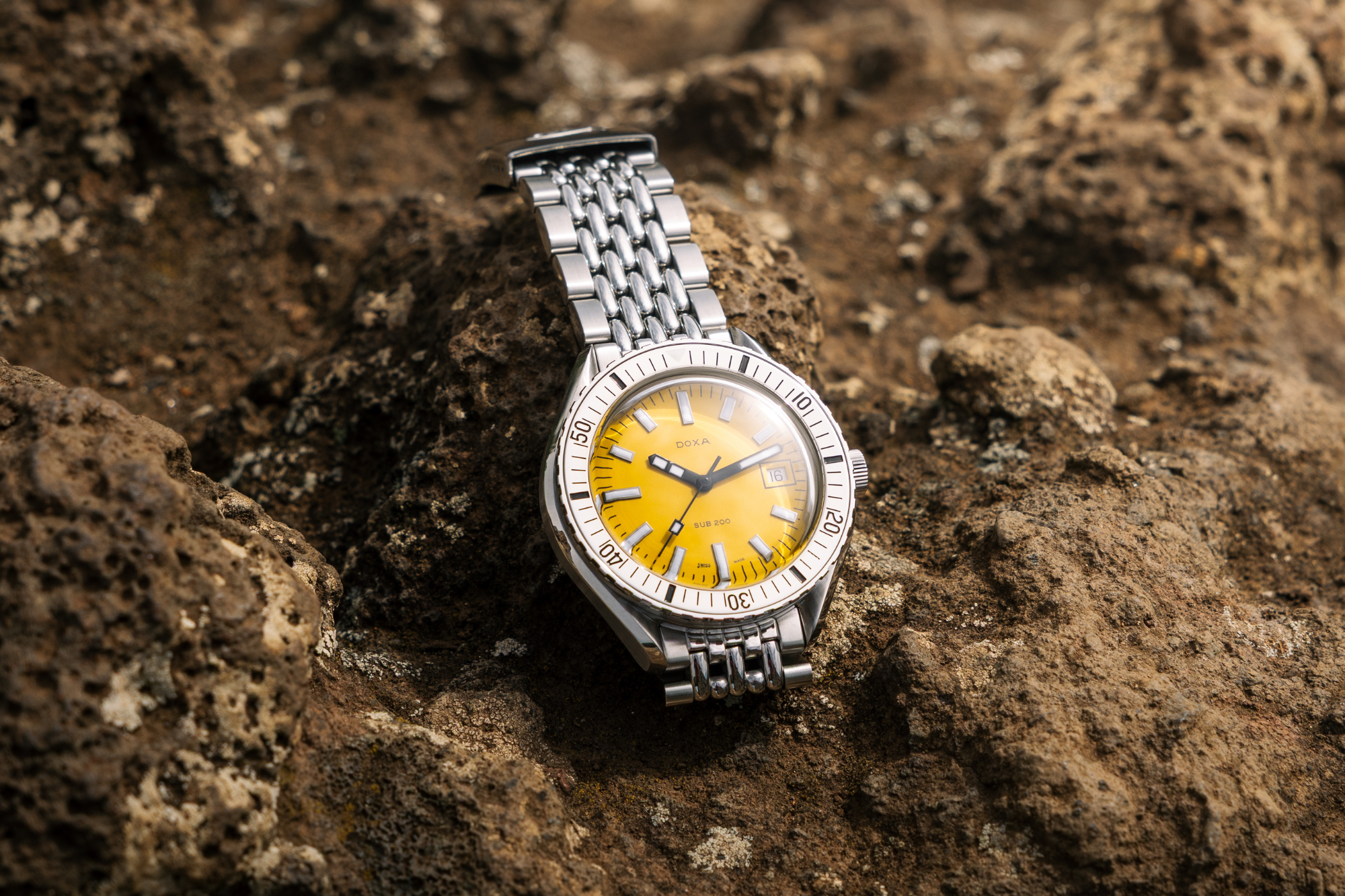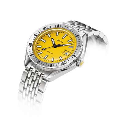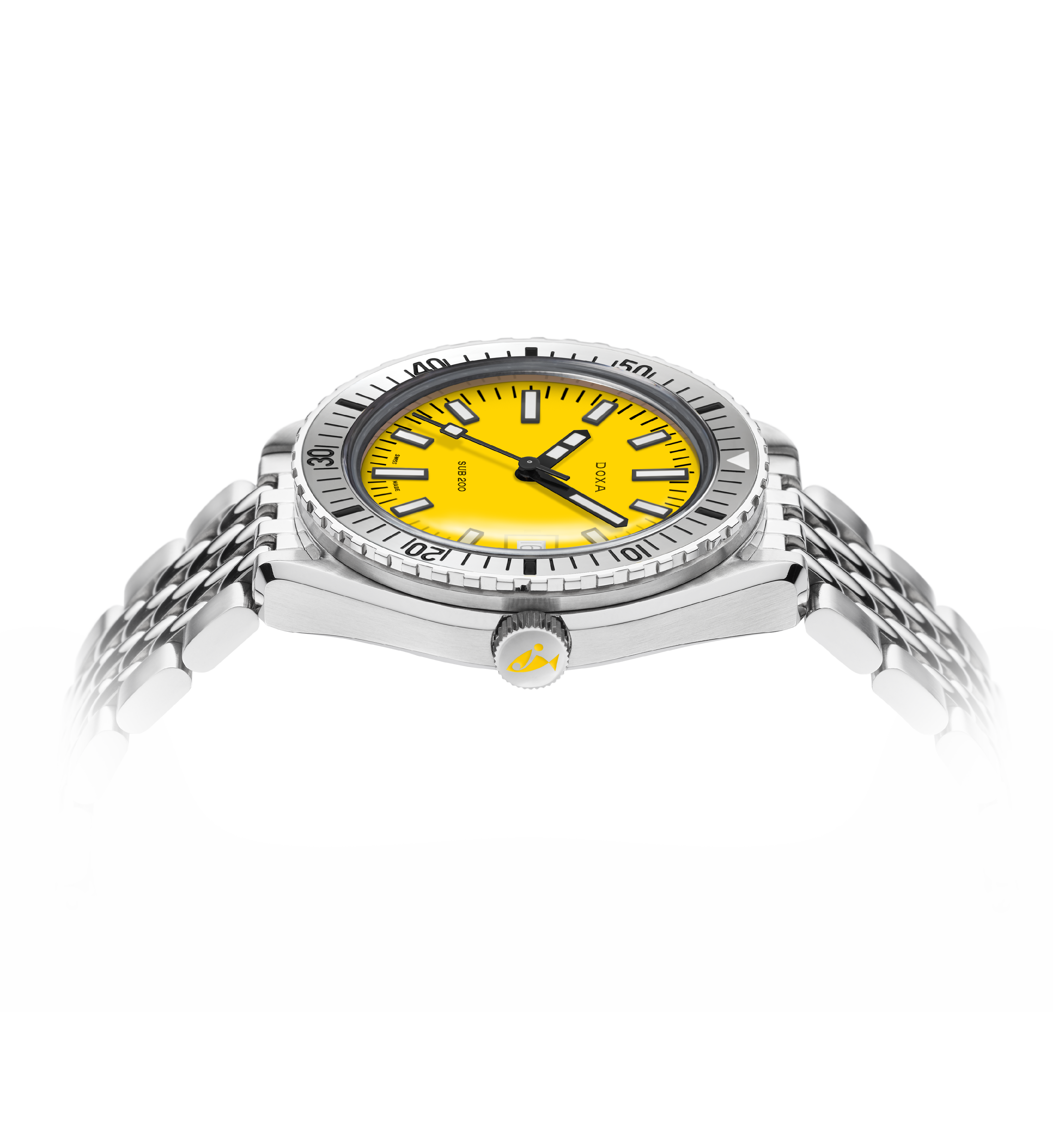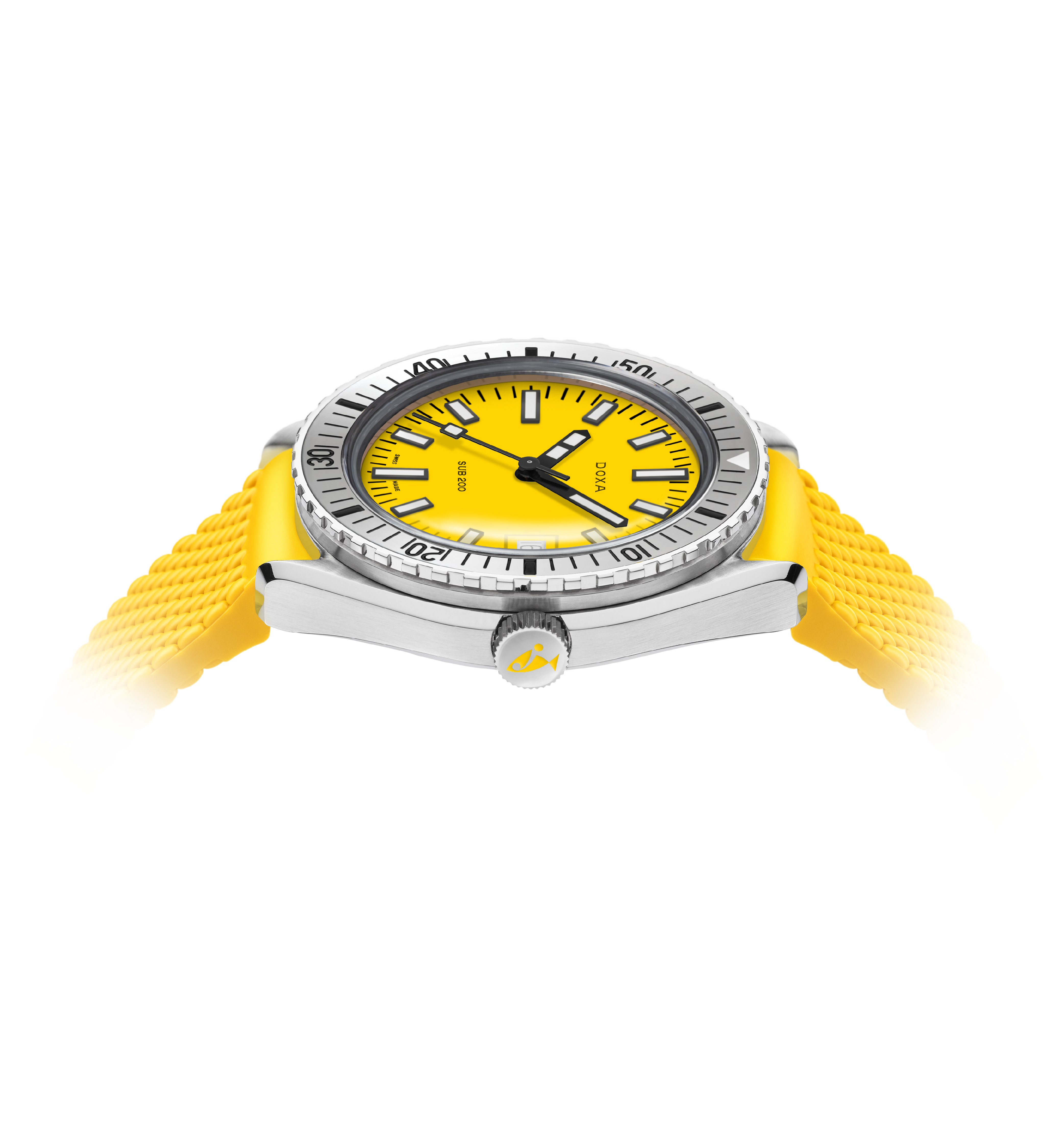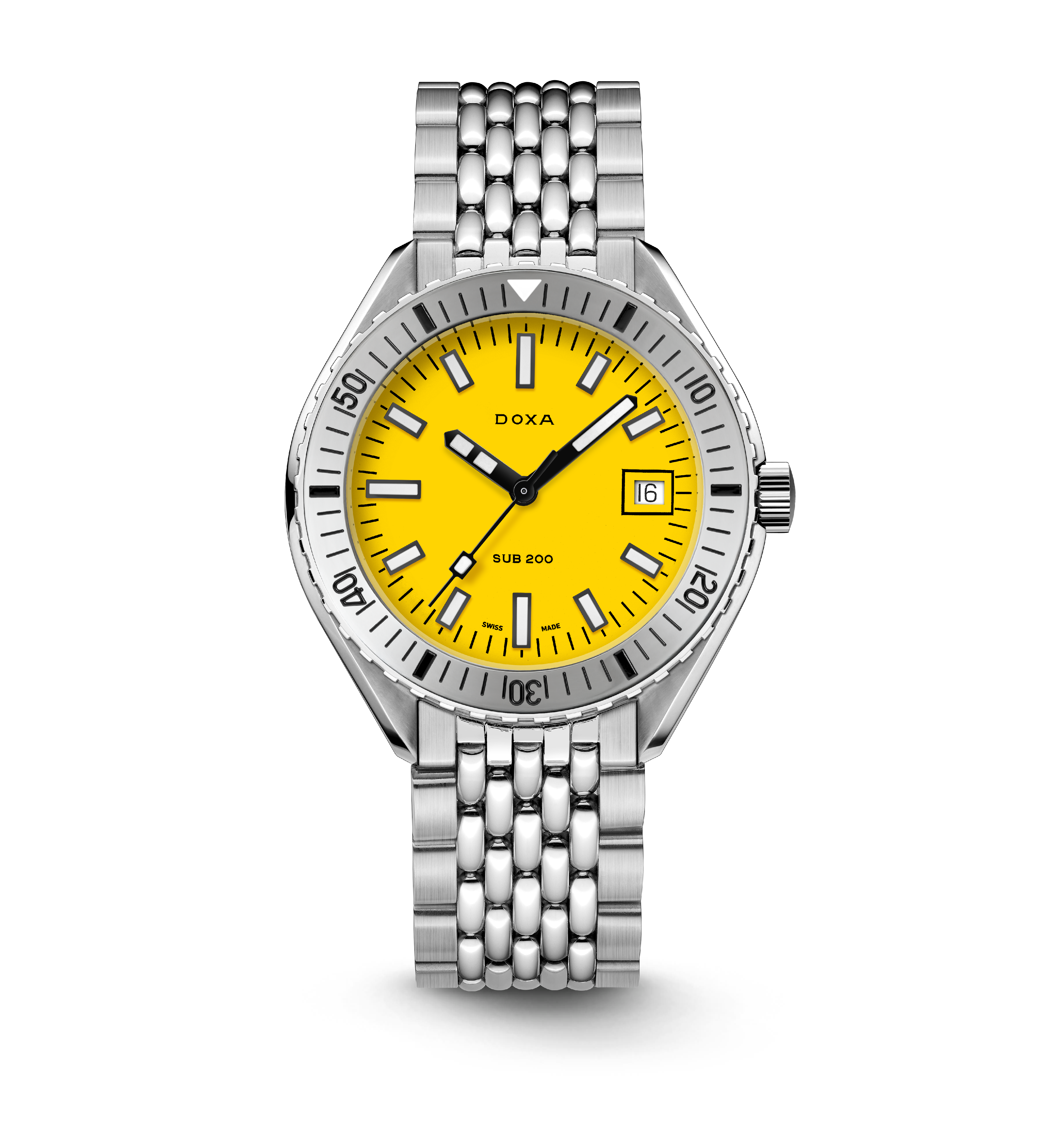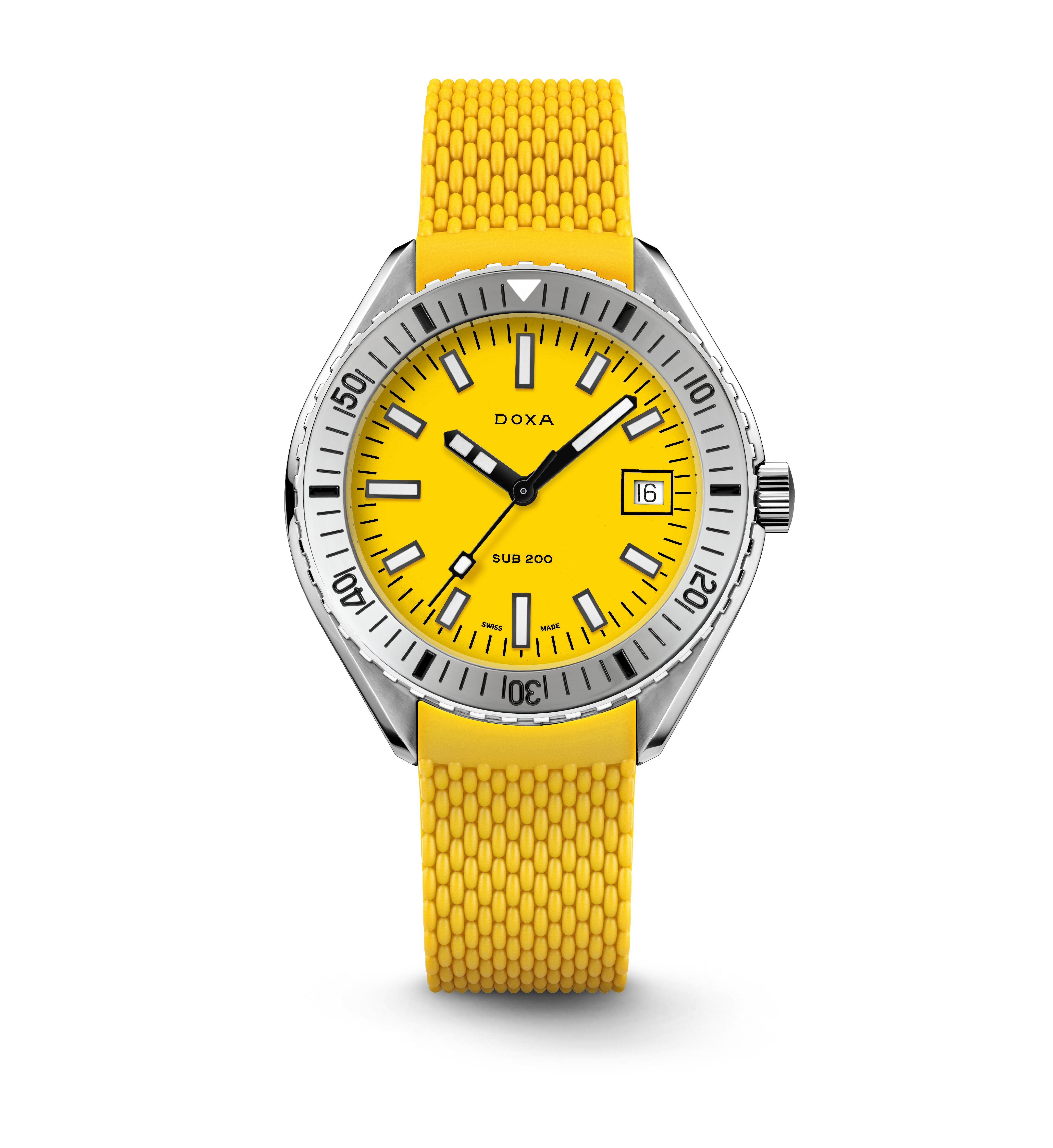 Dévoilée lors du salon Baselworld 2019, cette montre de plongée à trois aiguilles est dotée d'un boîtier en acier inoxydable 316L de la plus haute qualité. D'un diamètre de 42 mm, la SUB 200 est surmontée d'un verre saphir résistant aux rayures avec un revêtement antireflet et la courbure distinctive du plexiglas bombé utilisé autrefois. Étanche jusqu'à 200 mètres (20 ATM), ce modèle est doté d'une lunette tournante unidirectionnelle. Tous les éléments fournissant des informations utiles à la plongée, y compris la lunette, sont recouverts d'un revêtement luminescent Super-LumiNova®. Le bracelet est en acier inoxydable 316L et dispose d'un fermoir déployant avec le symbole du poisson DOXA.