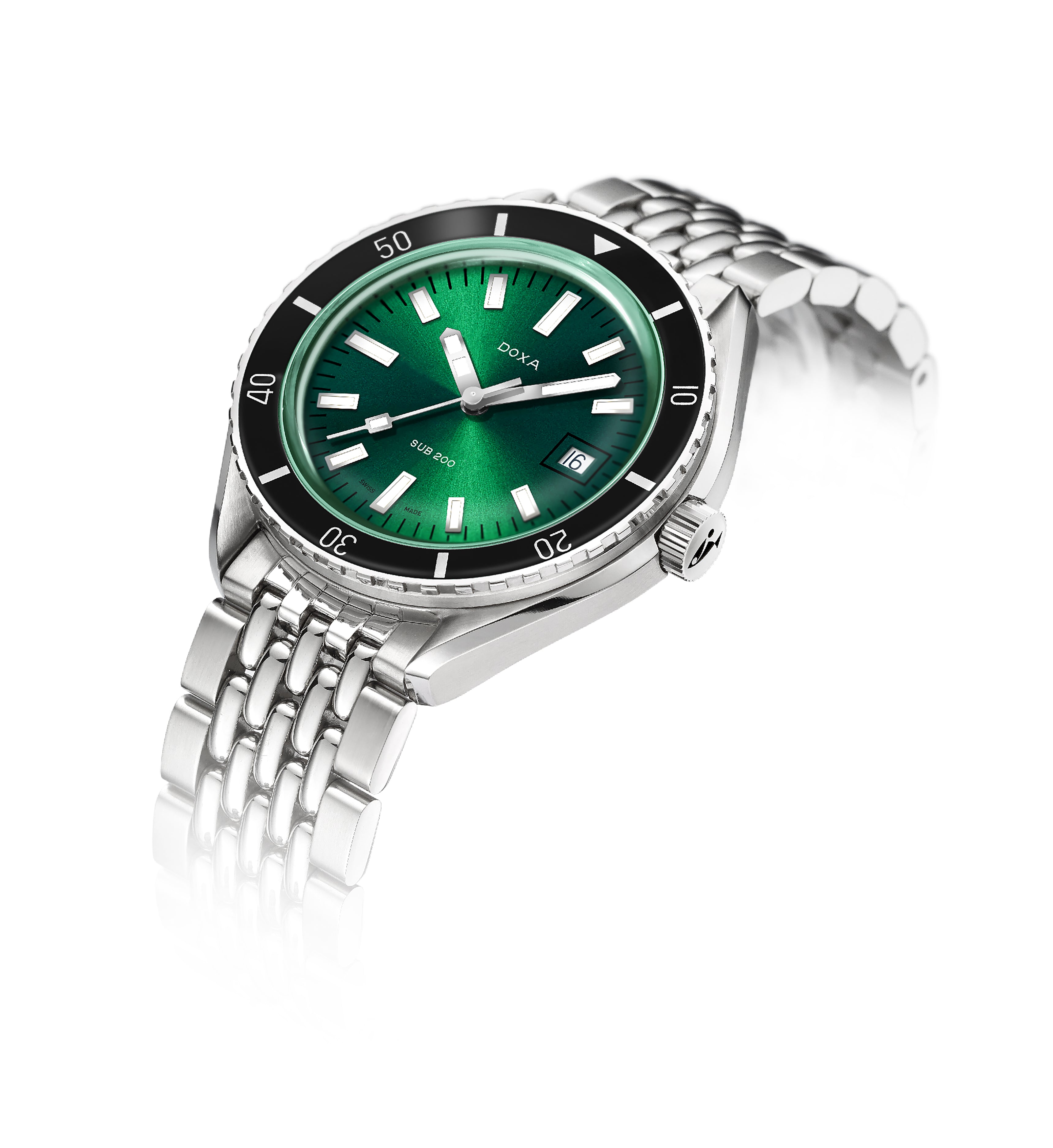 Dévoilée lors du salon Baselworld 2019, cette montre de plongée à trois aiguilles est dotée d'un boîtier en acier inoxydable 316L de la plus haute qualité. D'un diamètre de 42 mm, la SUB 200 est surmontée d'un verre saphir résistant aux rayures avec un revêtement antireflet et la courbure distinctive du plexiglas bombé utilisé autrefois. Étanche jusqu'à 200 mètres (20 ATM), ce modèle est doté d'une lunette tournante unidirectionnelle. Tous les éléments fournissant des informations utiles à la plongée, y compris la lunette, sont recouverts d'un revêtement luminescent Super-LumiNova®. Le bracelet est en acier inoxydable 316L et dispose d'un fermoir déployant avec le symbole du poisson DOXA.