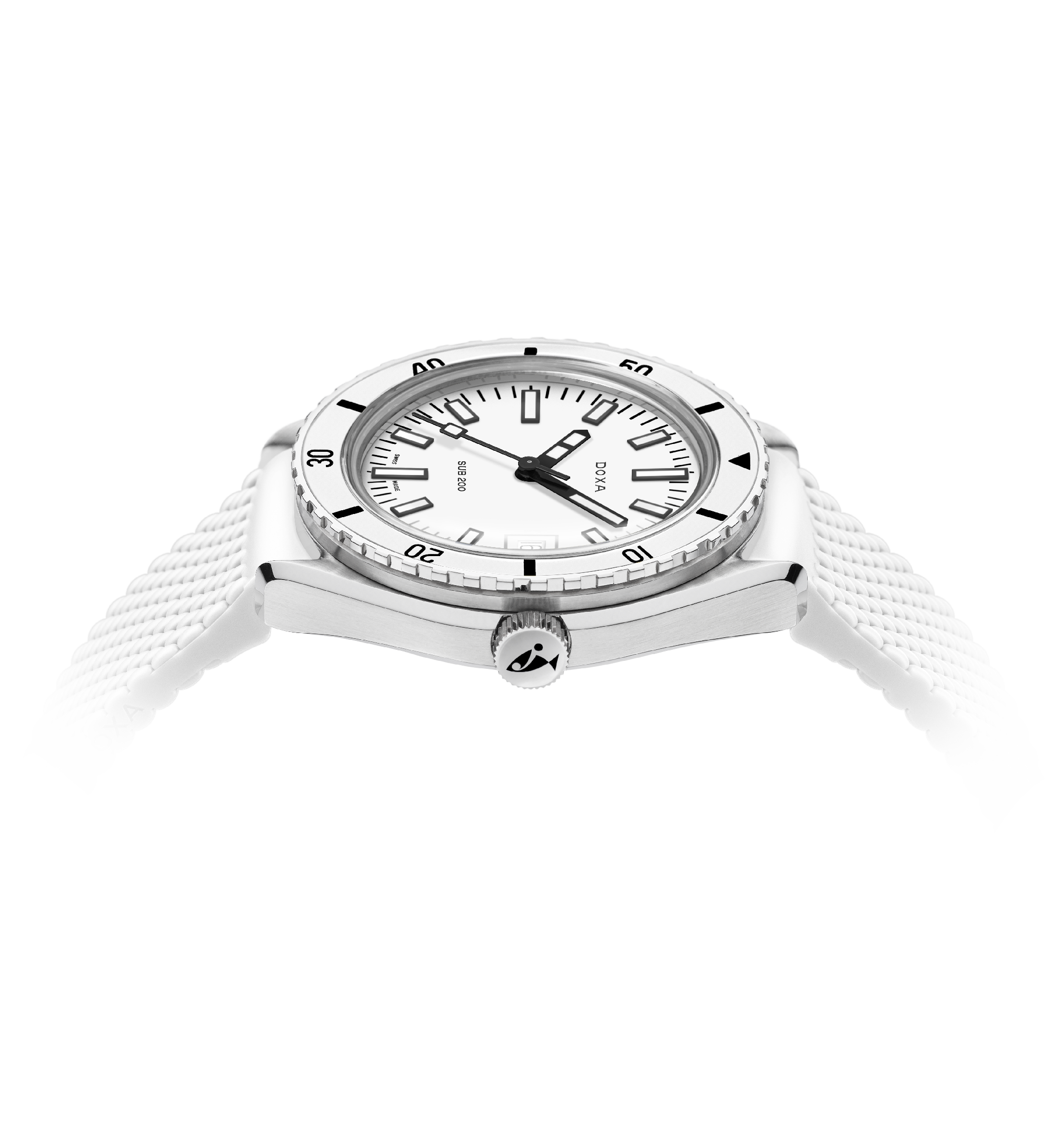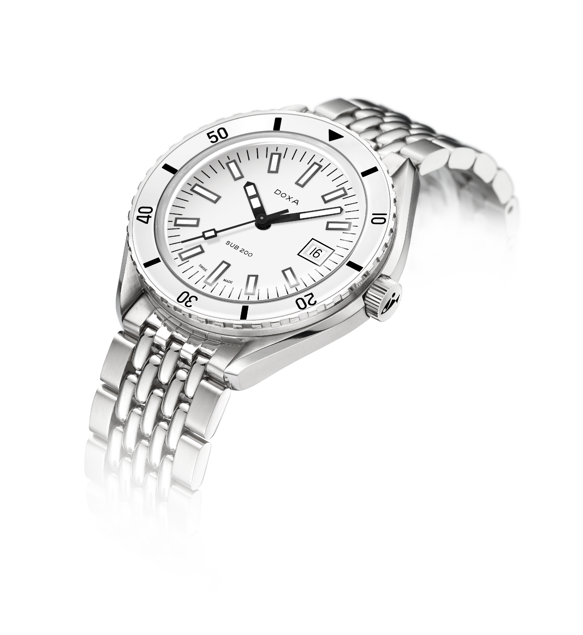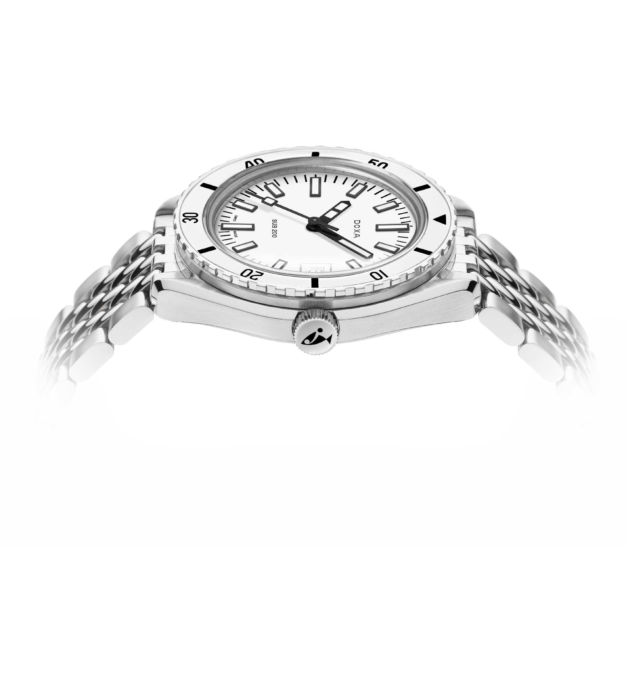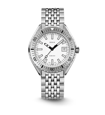 Dévoilée lors du salon Baselworld 2019, cette montre de plongée à trois aiguilles est dotée d'un boîtier en acier inoxydable 316L de la plus haute qualité. D'un diamètre de 42 mm, la SUB 200 est surmontée d'un verre saphir résistant aux rayures avec un revêtement antireflet et la courbure distinctive du plexiglas bombé utilisé autrefois. Étanche jusqu'à 200 mètres (20 ATM), ce modèle est doté d'une lunette tournante unidirectionnelle. Tous les éléments fournissant des informations utiles à la plongée, y compris la lunette, sont recouverts d'un revêtement luminescent Super-LumiNova®. Le bracelet est en acier inoxydable 316L et dispose d'un fermoir déployant avec le symbole du poisson DOXA.