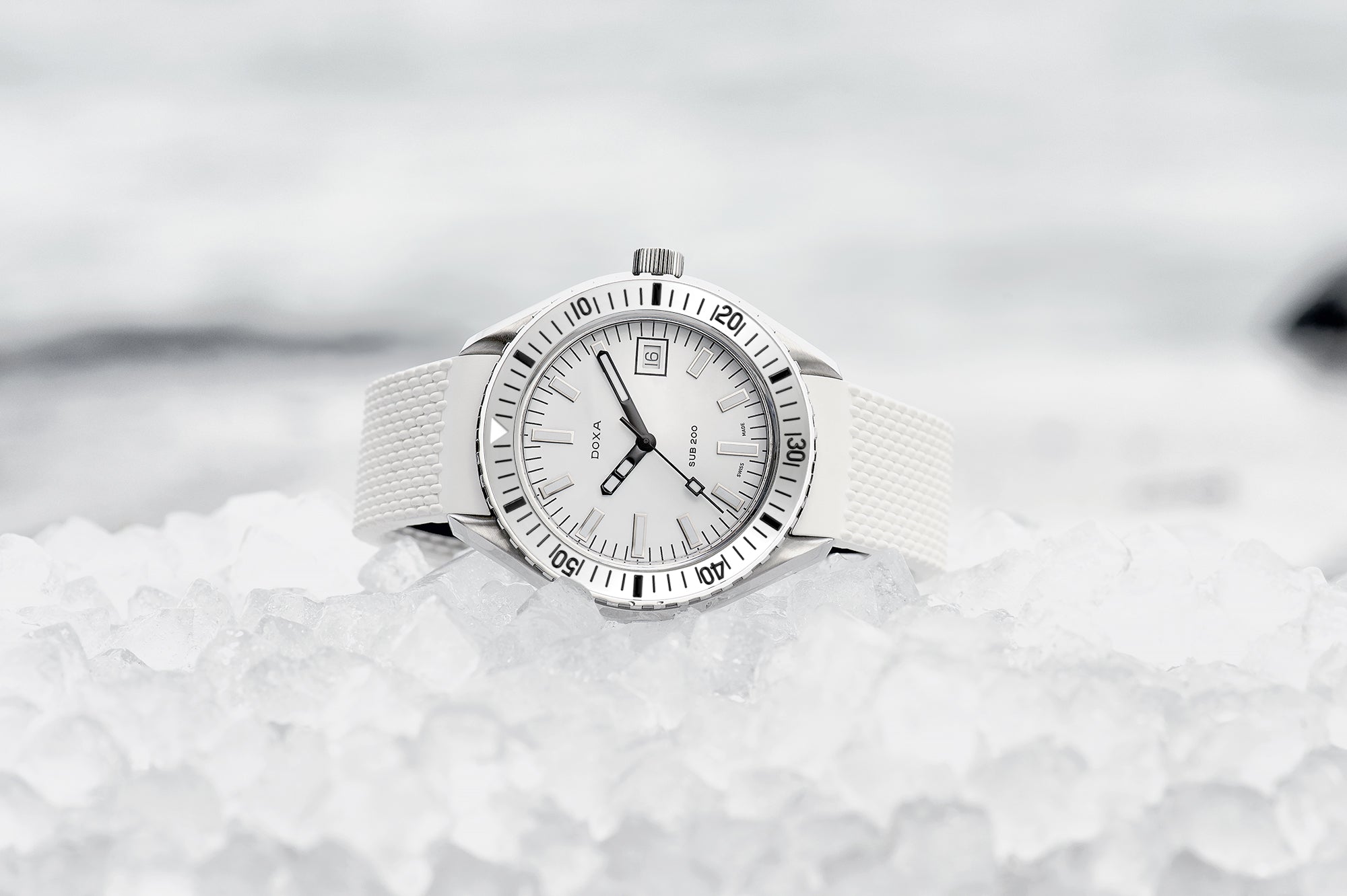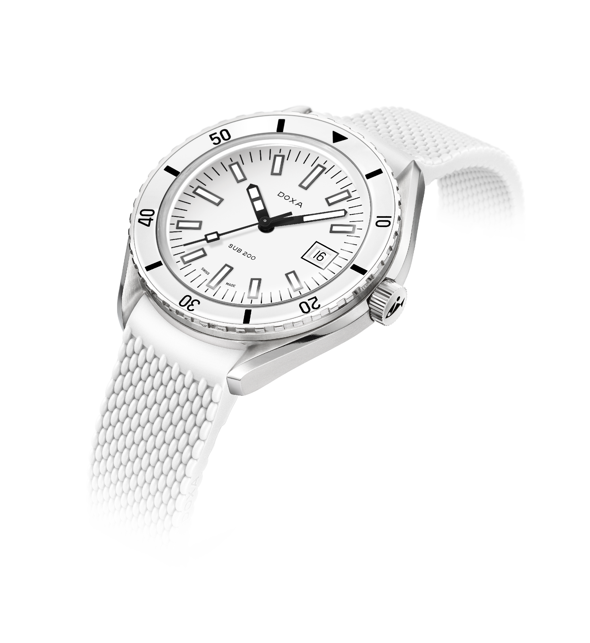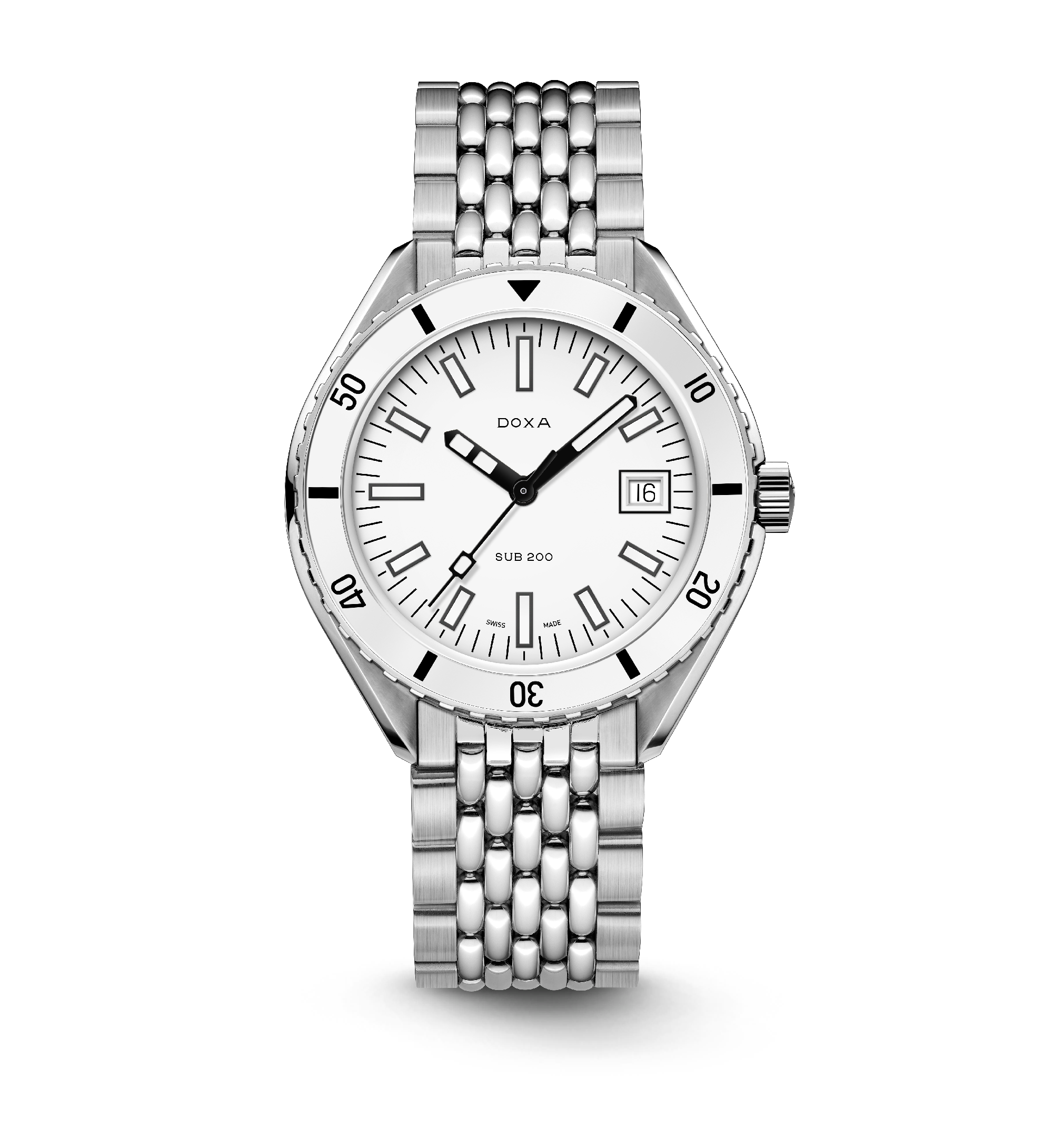 Dévoilée lors du salon Baselworld 2019, cette montre de plongée à trois aiguilles est dotée d'un boîtier en acier inoxydable 316L de la plus haute qualité. D'un diamètre de 42 mm, la SUB 200 est surmontée d'un verre saphir résistant aux rayures avec un revêtement antireflet et la courbure distinctive du plexiglas bombé utilisé autrefois. Étanche jusqu'à 200 mètres (20 ATM), ce modèle est doté d'une lunette tournante unidirectionnelle. Tous les éléments fournissant des informations utiles à la plongée, y compris la lunette, sont recouverts d'un revêtement luminescent Super-LumiNova®. Le bracelet est en acier inoxydable 316L et dispose d'un fermoir déployant avec le symbole du poisson DOXA.