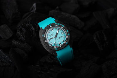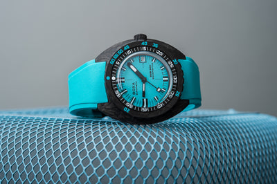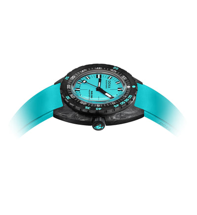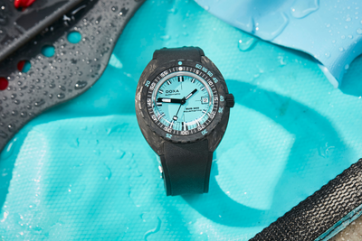 The SUB 300 in carbon is available in 8 colours with the choice of a rubber strap in black or in the same colour as the dial. Featuring distinctive DOXA cues on both sides, the strap is fitted with a black PVD-treated folding clasp decorated with the exclusive DOXA fish symbol. It also has an adjustable diving extension to accommodate the thickness of a wet suit.