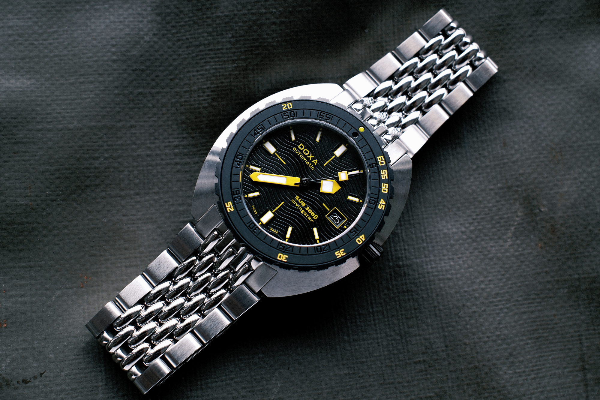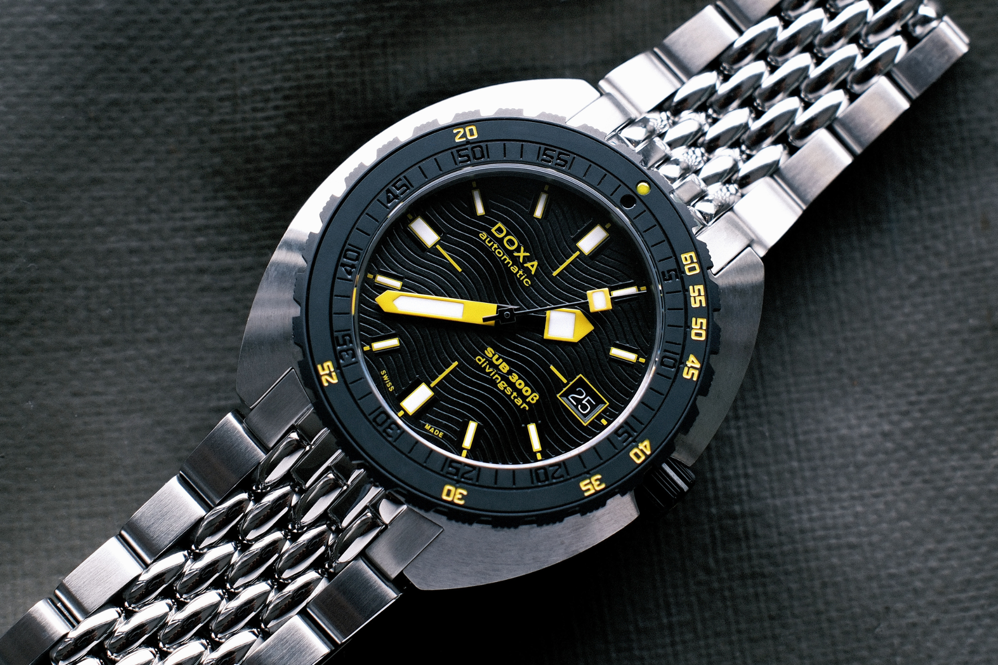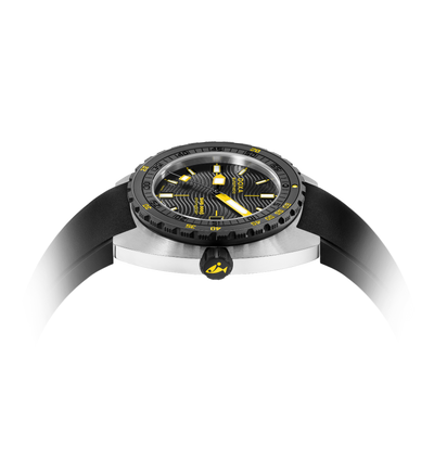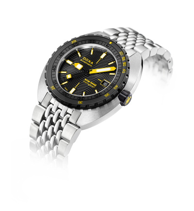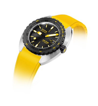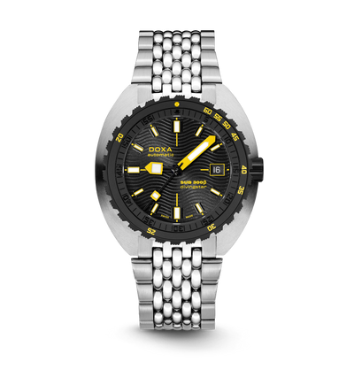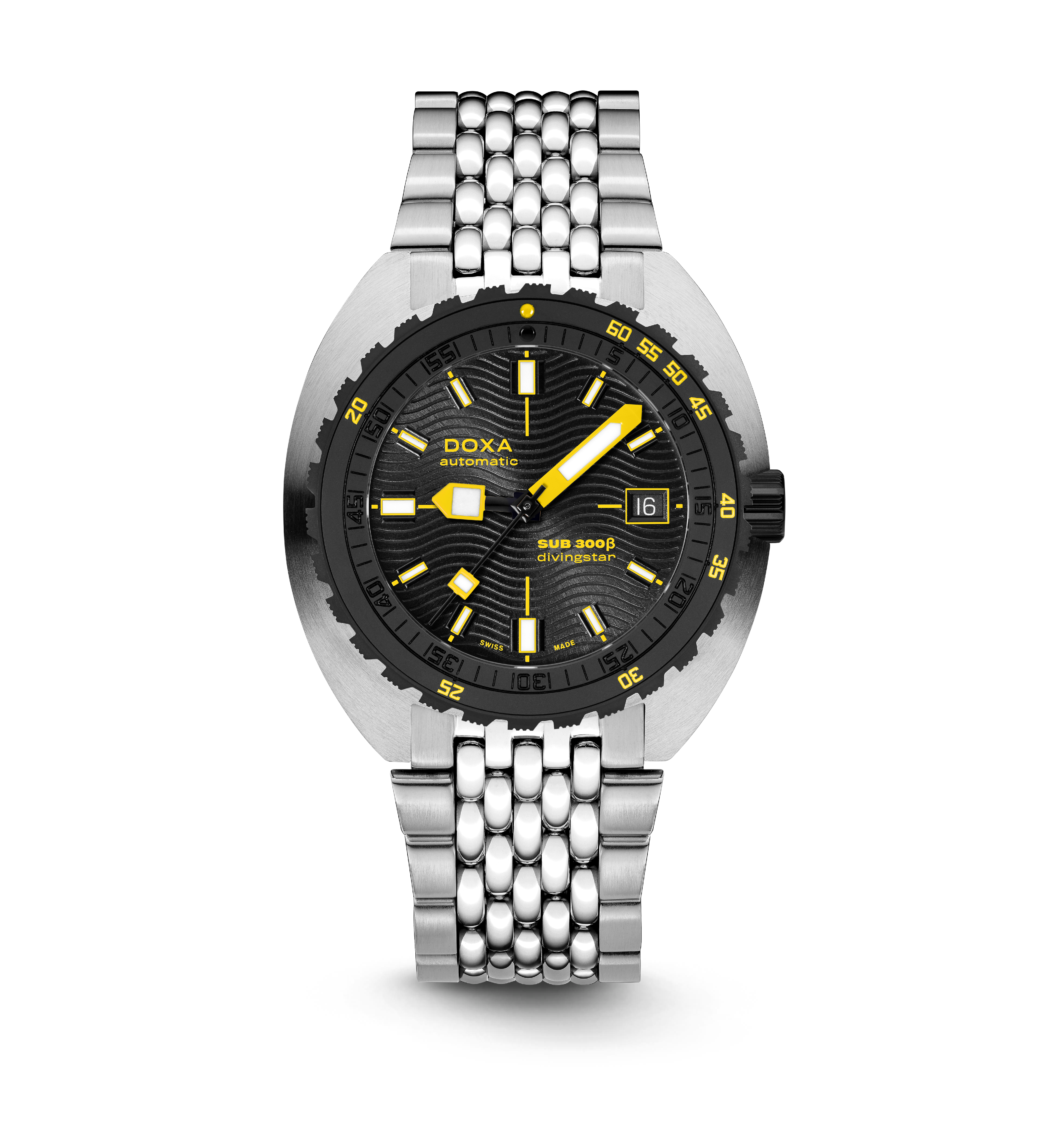 The SUB 300β sports watch combines functionality with style, maintaining foundational tool watch features in a redesigned 42.5 mm diameter case, now slimmer at 11.95 mm. The black ceramic bezel and screw-down crown enhance its sport-chic character, complemented by a sophisticated sunburst dial finish. Available with an FKM rubber strap or stainless-steel "Beads of Rice" bracelet, both featuring a ratcheting folding clasp, the watch is water-resistant up to 300 meters. With a scratch-resistant sapphire crystal, Swiss automatic movement, and a power reserve of around 38 hours, the SUB 300β is engineered for safety and exploration. True to DOXA's unconventional ethos, it blends the spirit of the times with an elegant, modern sport-chic look suitable for urban settings.