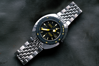 42.5mm stainless steel case, automatic movement, black dial with yellow accents.