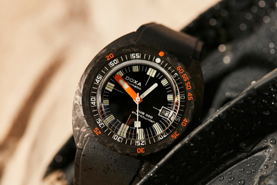 The SUB 300 in carbon is available in 8 colours with the choice of a rubber strap in black or in the same colour as the dial. Featuring distinctive DOXA cues on both sides, the strap is fitted with a black PVD-treated folding clasp decorated with the exclusive DOXA fish symbol. It also has an adjustable diving extension to accommodate the thickness of a wet suit.