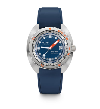 The SUB 300’s 42.5 mm case is made from the highest quality 316L stainless steel. The three-hand self-winding movement holds the prestigious COSC Certified Chronometer certification guaranteeing precision, robustness and reliability. It also provides a 38-hour power reserve. The date window is positioned at 3 o'clock. The SUB 300 naturally features the famous unidirectional rotating bezel, a DOXA patent, with the dual indication of dive time in minutes and depth in meters for calculating no-stop decompression dive times. Featuring a screw-down crown, its water-resistance is rated to 300 meters, or approximately 980 feet.