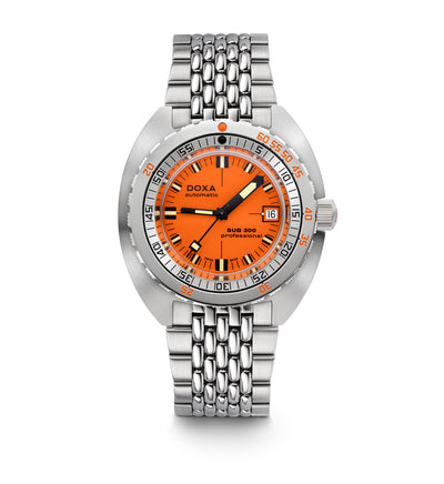 The SUB 300’s 42.5 mm case is made from the highest quality 316L stainless steel. The three-hand self-winding movement holds the prestigious COSC Certified Chronometer certification guaranteeing precision, robustness and reliability. It also provides a 38-hour power reserve. The date window is positioned at 3 o'clock. The SUB 300 naturally features the famous unidirectional rotating bezel, a DOXA patent, with the dual indication of dive time in minutes and depth in meters for calculating no-stop decompression dive times. Featuring a screw-down crown, its water-resistance is rated to 300 meters, or approximately 980 feet.
