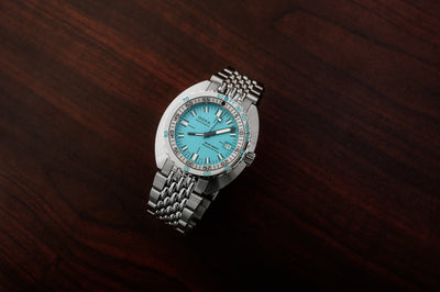 42.5mm stainless steel case, automatic movement, aquamarine dial.