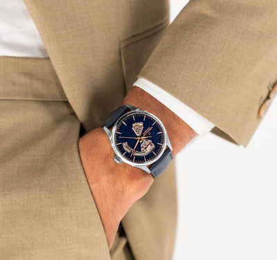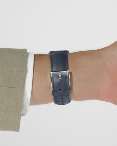 Offering a glimpse of its powerful inner mechanics, the Jazzmaster Open Heart lets precision take center stage with a new 42mm dial. Featuring a captivating midnight blue dial that sparkles, this showstopping timepiece fuses the modernity of urban architechture with the infinity of the cosmos. Showcasing Hamilton's ever-evolving craftsmanship and attention to detail, the dial brings the H-10 automatic movement into the spotlight. With its 80 hour power reserve and Nivachron™ balance spring, the Jazzmaster Open Heart Auto is fitted with an elegant blue leather strap or an intricate stainless steel bracelet.