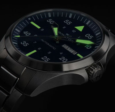 Conçue pour les vrais amoureux de l'aviation, la Khaki Aviation Pilot Day Date évoque l'esprit d'exploration et d'aventure des Khakis. Animé par le mouvement automatique H-30 doté d'une réserve de marche de 80 heures et d'un spiral Nivachron™, ce modèle présente un guichet de date et des chiffres agrandis sur le cadran pour une meilleure lisibilité. La Khaki Aviation Day Date 42 mm est montée sur un bracelet frais en acier inoxydable, associé à un riche cadran bleu, évoquant les possibilités d'un ciel clair et dégagé.