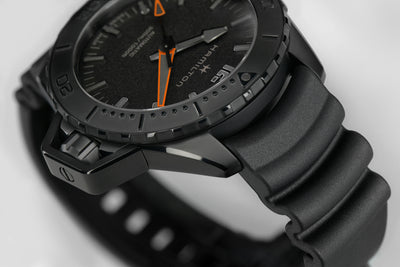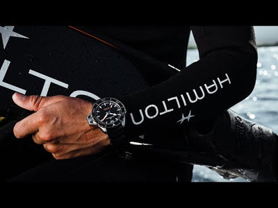 Dotée d'un nouveau look intrépide, la Khaki Navy Frogman Automatic est la montre Hamilton la plus techniquement apte à être utilisée en mer. Conçue pour la précision, la lisibilité et l'endurance, cet instrument de précision porte au poignet la puissance insondable de l'océan grâce à un protège-couronne de forme unique et à un bracelet en caoutchouc tactique à l'aspect vague.