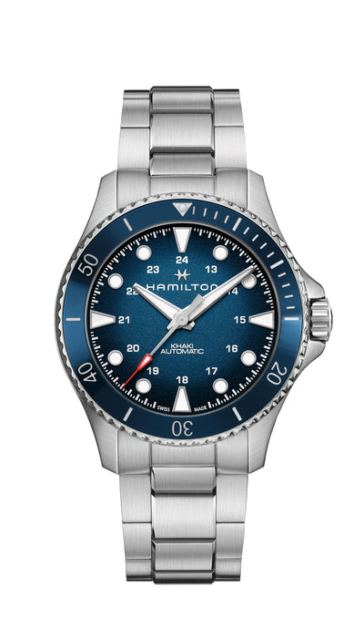 Luxury meets sport in this aquatic-inspired timepiece designed to be equally at home in a seaside cabana or deep sea exploring. A ceramic bezel, featuring precisely engraved numerals adds high-seas style to this Khaki Navy Scuba Automatic, and protects it from corrosive elements such as sand and saltwater. With a larger 43mm case, increased water resistance to 30 bar (300m) and an extra-legible dial, this high performance watch is ready for all your adventures on, in or under the water.