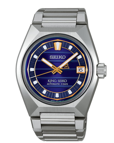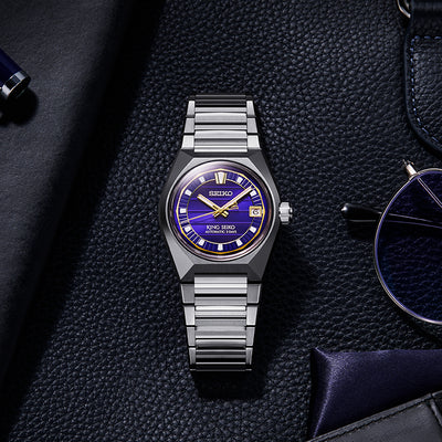 From the King Seiko Collection. First introduced in 1961, King Seiko became one of Seiko’s most technically innovative and stylish brands, noted for its distinct and dignified profile. Inspired by the King Seiko VANAC models from the 1970s, this vibrant timepiece features a bold case design with a sharp and prominent form and draws inspiration from the horizon of Tokyo, the birthplace of King Seiko. The specially engineered hand-assembled 35-jewel 8L45 movement beats at a frequency of 28,800 vibrations per hour with a power reserve of approximately 72 hours, 3 full days and offers enhanced accuracy for the ultimate in precision timekeeping. Reflecting the twilight stretching out across the Tokyo horizon, the blue-violet dial features a striking horizonal pattern with a three-dimensional dial ring and includes a gold V-shaped 12 o’clock index and second-hand symbolizing VANAC. The eye-catching watch is equipped with a box-shaped sapphire crystal with anti-reflective coating on the inner surface, a screw-down see-through case-back, and a crown adorned with the King Seiko crest. Crafted of stainless steel, with the combination of mirror and hairline finishing characteristic of the original King Seiko models, this exceptional timepiece includes a bracelet with two levers on the end-piece that can be pressed for easy removal and a deployment clasp with push button release. 10 bar, 100M Water Resistant.