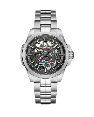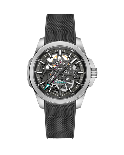 A sign of NORQAIN’s watchmaking craftsmanship, the Independence 22 model’s skeletonised Sellita movement is based on the architecture principles of beam construction: each support point is held by at least two arms. Wearers and admirers can enjoy a stunning view of the robust and shock-resistant movement through the sapphire glass on both sides of the stainless steel case. The 40mm case features three different finishes – brushed, polished and sandblasted.