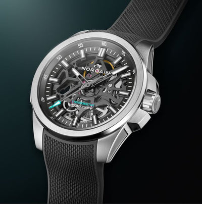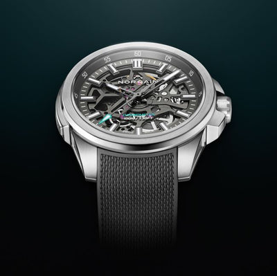 Le cadran transparent offre au porteur et aux admirateurs une vue claire sur le cœur du garde-temps où les composants du calibre NORQAIN NN08S certifié par le COSC, de couleur ruthénium métallique, sont responsables de son design accrocheur. Le logo NORQAIN se trouve sur le verre saphir inrayable et la désignation " Chronomètre " sur la bague, ce qui permet de mieux voir le mouvement squeletté. L'aiguille des secondes a une pointe rouge pour une meilleure lisibilité, les index et l'échelle des minutes se détachent en blanc, et les aiguilles squelettées sont revêtues de Super-LumiNova® C1 X1 de haute qualité qui émet une couleur blanche.