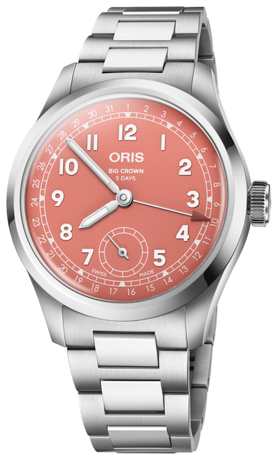 The Big Crown Pointer Date Calibre 403 is our icon reborn. Now cased in 40.00 mm of stainless steel and set on a new H-link metal bracelet with an Oris developed clasp, it also has a stylish, terracotta dial, a colour matched by the tip of the Pointer Date hand