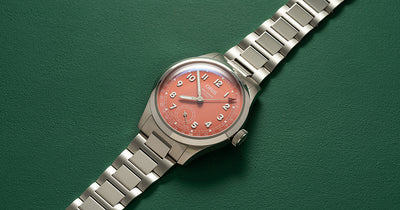 40mm stainless steel case, automatic in-house Calibre 403 movement, terracotta (pink) dial, stainless steel bracelet.