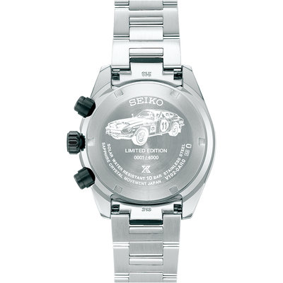 The case back is adorned with an original illustration of the winning rally car, Datsun 240Z.