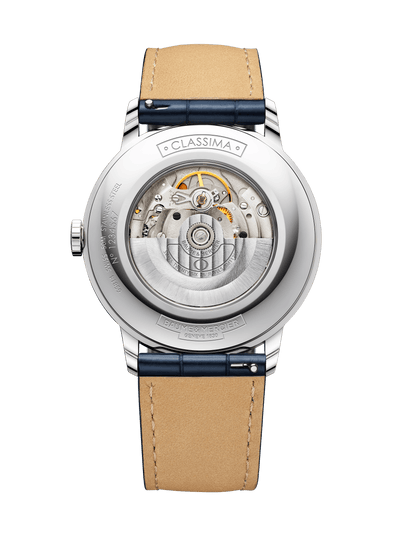 La Classima Automatic est une montre automatique classique en acier inoxydable, dotée d'un décor guilloché emblématique et d'aiguilles masculines en acier bleu. C'est une montre de luxe qui répond aux goûts des professionnels urbains modernes. Les aiguilles en acier bleuté parcourent le cadran argenté opalin, décoré de lignes guillochées et de chiffres romains, de cette montre fabriquée en Suisse. La montre ronde de 42 mm est animée par un mouvement mécanique à remontage automatique, visible sous le fond du boîtier en verre saphir inrayable. Elle présente des chiffres romains pour marquer les heures ainsi que des indicateurs noirs pour les minutes et les secondes sur le pourtour du cadran argenté. Un bracelet en acier poli ou un bracelet en cuir bleu avec un motif en alligator équilibre parfaitement les lignes épurées et l'aspect lisse du cadran de la montre.
