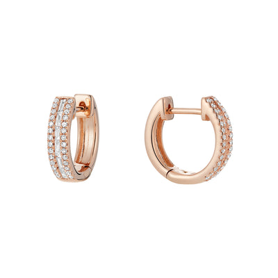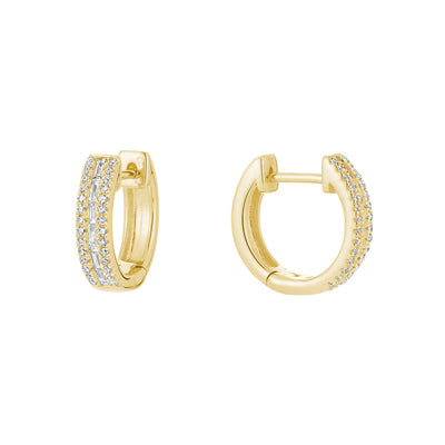 La boucle d'oreille en diamant avec une touche de modernité ! Ces boucles d'oreilles cerceau en diamant de 14k à trois rangs, taille baguette et taille ronde, sont serties à la main en or blanc, rose ou jaune 14k, avec un poids total approximatif de 0,24 carat. Les boucles d'oreilles sont composées de 12 pierres de baguette serties à la main dans un sertissage en canal, entourées de 56 pierres rondes de taille brillante serties à la main. Le terme "Huggy" est utilisé parce que la boucle d'oreille est faite pour serrer le lobe de l'oreille, en laissant très peu d'espace entre la boucle d'oreille et l'oreille.