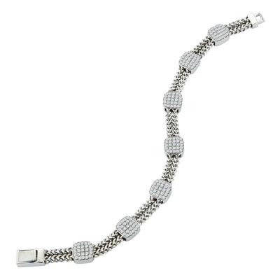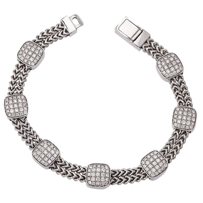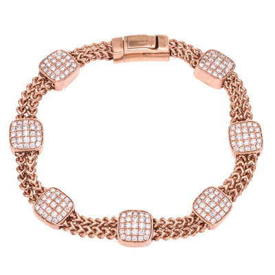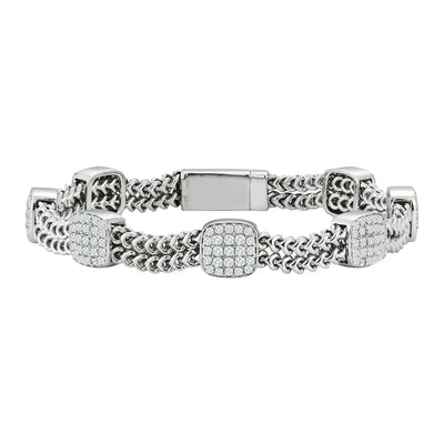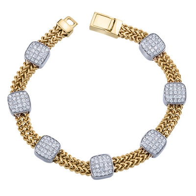 Ce bracelet souple contemporain en forme de coussin à sept stations et à double maillon de chaîne est fabriqué en or blanc ou jaune 14K et se compose de 175 pierres serties à la main, soit un poids total approximatif de 2,10 ct. Chaque station est sertie de 25 diamants ronds de taille brillant et est fixée sur une double chaîne en or massif. Le bracelet souple mesure environ 7,25 pouces et est importé d'Italie.
