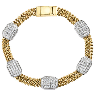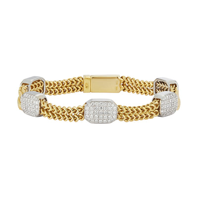 Ce bracelet souple contemporain en diamant à cinq stations de forme rectangulaire et à double maillon de chaîne est fabriqué en or blanc ou jaune 14K et se compose de 175 pierres serties à la main, soit un poids total approximatif de 2,25 ct. Chaque station est sertie de 45 diamants ronds de taille brillant et est fixée sur une double chaîne en or massif. Le bracelet souple mesure environ 7,25" et est importé d'Italie.