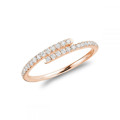 Cette bague enveloppe linéaire en diamant est composée de diamants ronds de taille brillante sertis dans une bande de style enveloppe à la mode. Fabriquée en or blanc, rose ou jaune 14 carats, la bague a un poids total approximatif de 0,25 carat. La bague se compose de 28 pierres serties à la main. Les diamants sont sertis à mi-chemin de la bague.