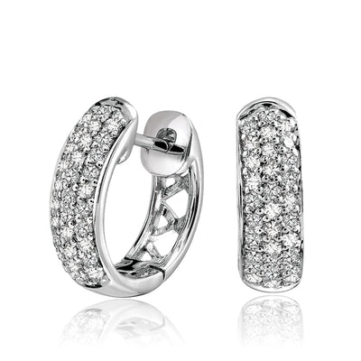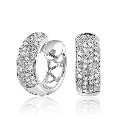 Boucle d'oreille en pavé de diamants ! Ces boucles d'oreilles rondes en diamant brillant de 14 carats sont serties à la main en or blanc ou jaune de 14 carats, avec un poids total approximatif de 0,30 ct, 0,40 ct et 0,50 c t. Les boucles d'oreilles sont composées respectivement de 62, 92 et 126 pierres serties à la main. Le terme "Huggy" est utilisé parce que la boucle d'oreille est faite pour serrer le lobe de l'oreille, en laissant très peu d'espace entre la boucle d'oreille et l'oreille. Plus le poids total en carats de ces boucles d'oreille est élevé, plus la boucle d'oreille devient large. Veuillez vous référer aux photos, la paire de cercles pavés commence à trois rangées de large et se termine à cinq rangées. Le style classique de l'anneau en pavé de diamants est l'un des styles de boucles d'oreilles les plus polyvalents de la boîte à bijoux. Elle peut être habillée en haut ou en bas selon l'occasion.