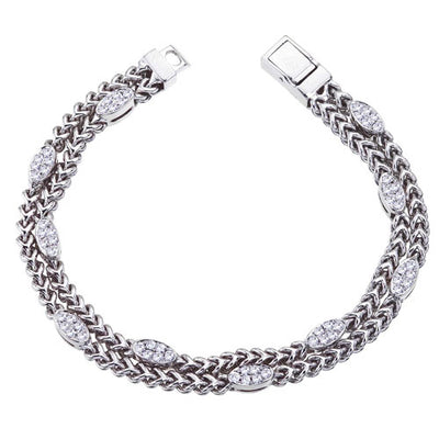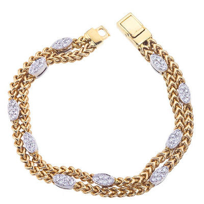 Ce bracelet souple contemporain en diamant de forme ovale à dix stations et à double maillon de chaîne est fabriqué en or blanc ou jaune 14 carats et se compose de 60 pierres serties à la main équivalant à un poids total approximatif de 1,00 ct. Chaque station est sertie de 6 diamants ronds de taille brillant et est fixée sur une double chaîne en or massif. Le bracelet souple mesure environ 7,25 pouces et est importé d'Italie.