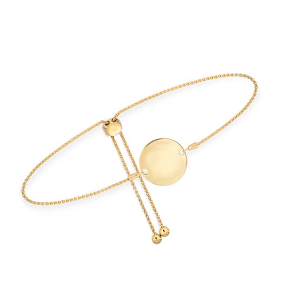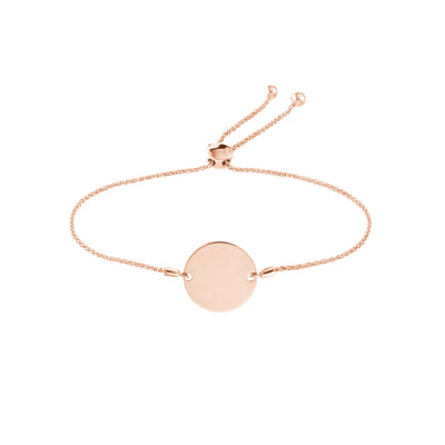 Bracelet bolo gravable en forme de disque rond. Fabriqué en or jaune, rose ou blanc 14k massif mesurant une longueur maximale de poignet de 9,5 pouces et moins. Il peut s'adapter à toutes les tailles de poignet de femmes et est très facile à ajuster. Parfait pour faire un cadeau à quelqu'un de spécial et s'empiler avec des bracelets supplémentaires.