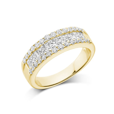 Cette large bague sertie de diamants baguettes, de diamants taille princesse et de diamants ronds est sertie d'un mélange de pierres taille princesse et de pierres taille baguette au centre, entouré de deux rangées de diamants ronds de chaque côté, les trois rangées allant jusqu'à la moitié de la tige. Cette bague est disponible en or blanc, rose ou jaune 14k et a un poids total approximatif en carats de 1,32ct. La bague est composée de 6 diamants baguette sertis à la main, de 5 diamants taille princesse sertis à la main et de 28 diamants ronds taille brillant.