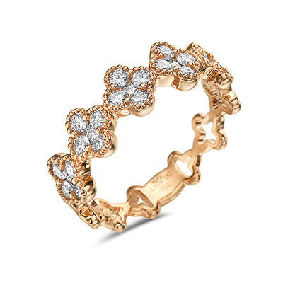 Un look audacieux avec une touche de vintage ! Cet anneau de demi-éternité en forme de trèfle à diamants ronds et au travail filigrané offre un mélange de goûts modernes et vintage. Disponible en or blanc, rose ou jaune 18 carats, l'anneau a un poids total approximatif de 0,67 carat. L'anneau se compose de 25 pierres serties à la main avec un travail filigrane autour de chaque trèfle. Les diamants sont sertis à mi-chemin de l'anneau.