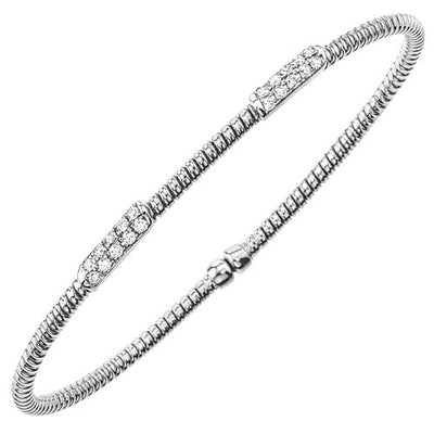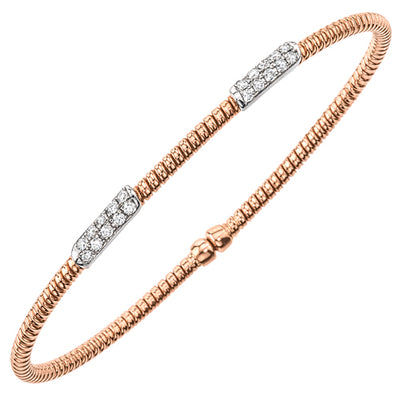 Ce bracelet de diamants contemporain à deux stations est fabriqué en or blanc, rose ou jaune 18 carats et se compose de 20 pierres serties à la main, soit un poids total approximatif de 0,25 ct. Chaque station est sertie de 10 diamants ronds de taille brillante et est fixée sur un solide bracelet ouvert enroulé. Le bracelet est importé d'Italie et s'adapte à la plupart des poignets de femmes.