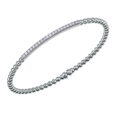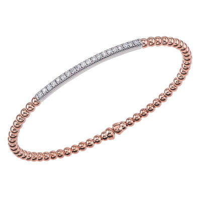 Ce bracelet contemporain en or blanc, rose ou jaune 18 carats est composé de 20 pierres serties à la main, soit un poids total approximatif de 0,35 ct. La barre de diamant est fixée sur un bracelet ouvert en perles solides. Ces bracelets sont parfaits pour empiler plusieurs bracelets ensemble, pour en porter un seul ou pour l'associer à un bracelet de tennis. Le bracelet est importé d'Italie et s'adapte à la plupart des poignets féminins.