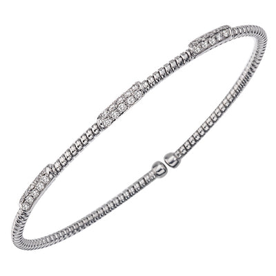 Ce bracelet de diamants contemporain à trois stations est fabriqué en or blanc, rose ou jaune 18 carats et se compose de 30 pierres serties à la main, soit un poids total approximatif de 0,40 ct. Chaque station est sertie de 10 diamants ronds de taille brillante et est fixée sur un solide bracelet ouvert enroulé. Le bracelet est importé d'Italie et s'adapte à la plupart des poignets de femmes.