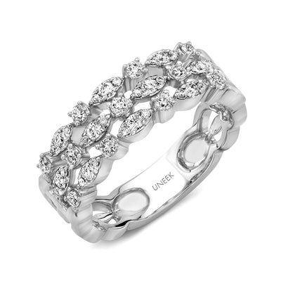 Les motifs géométriques rectilignes de la dentelle au torchon ont servi d'inspiration pour cette bande en or 18 carats à illusions empilées ; des grappes de brillants ronds en forme de navette alternent avec des ronds singuliers le long du haut de la bande, horizontalement et verticalement, créant un look simple mais saisissant ; le nombre total de diamants est de 41, pour un poids total combiné de 0,40 carats ; disponible en or blanc, rose ou jaune 18 carats.