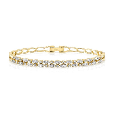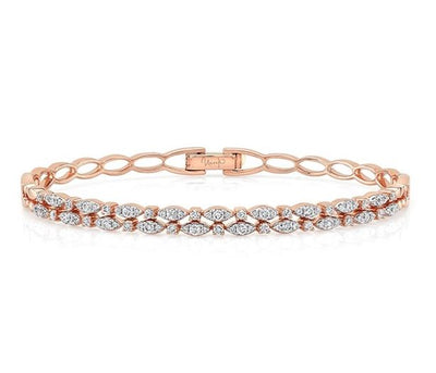 Conçu comme un bracelet empilable, mais suffisamment important pour être porté seul, ce bracelet à deux rangs porte un total de 76 diamants ronds ; dans chaque rang, des trios de diamants de tailles différentes en grappes en forme de navette alternent avec des diamants solitaires ; la partie inférieure menant au fermoir est ajourée, comme un lien. Construit en or blanc, rose ou jaune 18 carats, son poids total est d'environ 1,00 carat. Le bracelet s'adapte à la plupart des poignets de femmes.