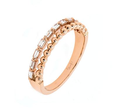 Des duos de délicates perles en or poli et de baguettes en diamant, disposés rangée par rangée, constituent cette bague d'empilement ultra-féminine. Disponible en or blanc, rose ou jaune 14 carats, la bague est composée de 10 diamants taille baguette d'un poids total approximatif de 0,32 ct.