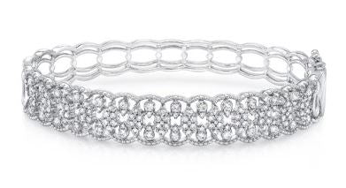 Ce bracelet de diamants de rêve présente un motif ajouré inspiré de la dentelle de la broderie anglaise ; des grappes en forme de navette nord-sud occupent le centre de la rangée du milieu, ancrées à chaque extrémité à la fantaisie des bordures festonnées garnies de milgrain par des rangées extérieures de délicates grappes en forme de poire ; le nombre total de diamants est de 134, avec un poids combiné d'environ 1,84 carats ; le dessous du bracelet présente un motif à double trait en poli haute qualité ; en or blanc 14 carats, rose ou jaune. Convient à la plupart des poignets de femmes.