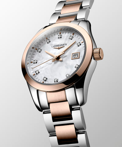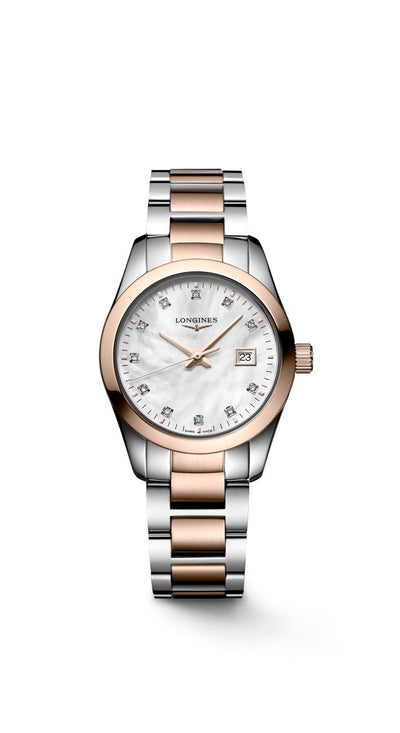 Longines Conquest Classic Quartz (White MOP Dial / 29mm / Two-Tone Rose)