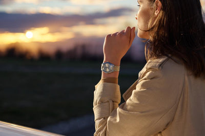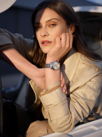 37mm stainless steel case, automatic COSC Certified movement, silver/champagne dial, stainless steel bracelet.