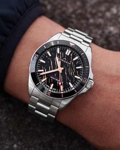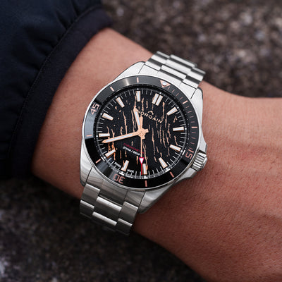 Boîtier en acier inoxydable de 40 mm, mouvement automatique Manufactured NN20/1 Kenissi, cadran Black Glacier avec des fissures dorées inspirées des crevasses du Mont Everest, bracelet en acier inoxydable.