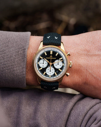 Boîtier en bronze de 40 mm, mouvement chronographe automatique, cadran noir avec sous-cadrans blancs, bracelet en caoutchouc perlon noir.