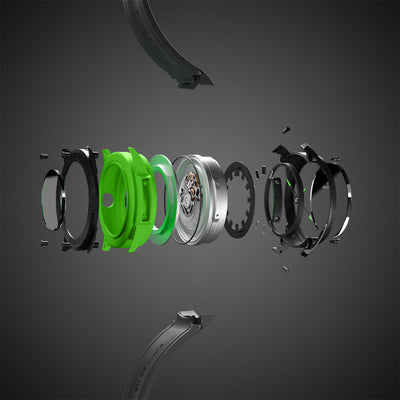 L'étui comporte des pièces NORTEQ séparées en haut et en bas, qui servent de cage de protection et sont reliées et fixées à l'aide de vis fabriquées sur mesure. Le pare-chocs en caoutchouc BIWI absorbe les chocs de manière fiable, même lors des activités les plus extrêmes. La résistance à l'eau jusqu'à une profondeur de 200 mètres élargit la gamme de sports pour lesquels la Wild ONE est adaptée. Au total, le boîtier est composé de 25 pièces, dont quatre vis gravées d'un motif de sommet de montagne.