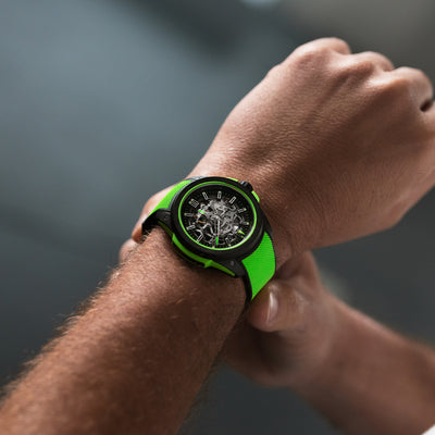 Boîtier norteq de 42 mm, mouvement automatique, cadran squelette avec accents verts, bracelet en caoutchouc vert.