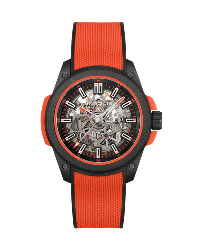 Boîtier norteq de 42 mm, mouvement automatique, cadran squelette avec accents orange, bracelet en caoutchouc orange.