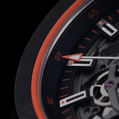 La NORQAIN Independence Wild ONE, fabriquée avec notre matériau exclusif de fibre de carbone NORTEQ ultra-léger et ultra-robuste, est la montre de sport par excellence. Équipé de notre mouvement squeletté unique, ce modèle allie parfaitement haute performance et prestige horloger. La Wild ONE a été conçue en collaboration avec Jean-Claude Biver, l'équipe NORQAIN et les meilleurs fournisseurs suisses. Ce modèle Wild ONE est doté d'un boîtier NORTEQ noir à effet marbré. Un amortisseur en caoutchouc turquoise plage, qui recouvre le conteneur en titane abritant le NN08S c squeletté, est visible entre la cage de protection NORTEQ. La structure unique des mouvements squelettes NORQAIN est basée sur les principes architecturaux de la construction en poutres : chaque point d'appui est maintenu par au moins deux bras. Cela rend le mouvement plus robuste et plus durable que la construction traditionnelle. La plaque NORQAIN dans le même matériau noir NORTEQ se trouve sur le côté du boîtier. Les aiguilles et les index squelettés sont recouverts de Superluminova X1 turquoise. Ce modèle est disponible avec un bracelet intégré en caoutchouc turquoise sans cruauté envers les animaux, avec un bord noir.