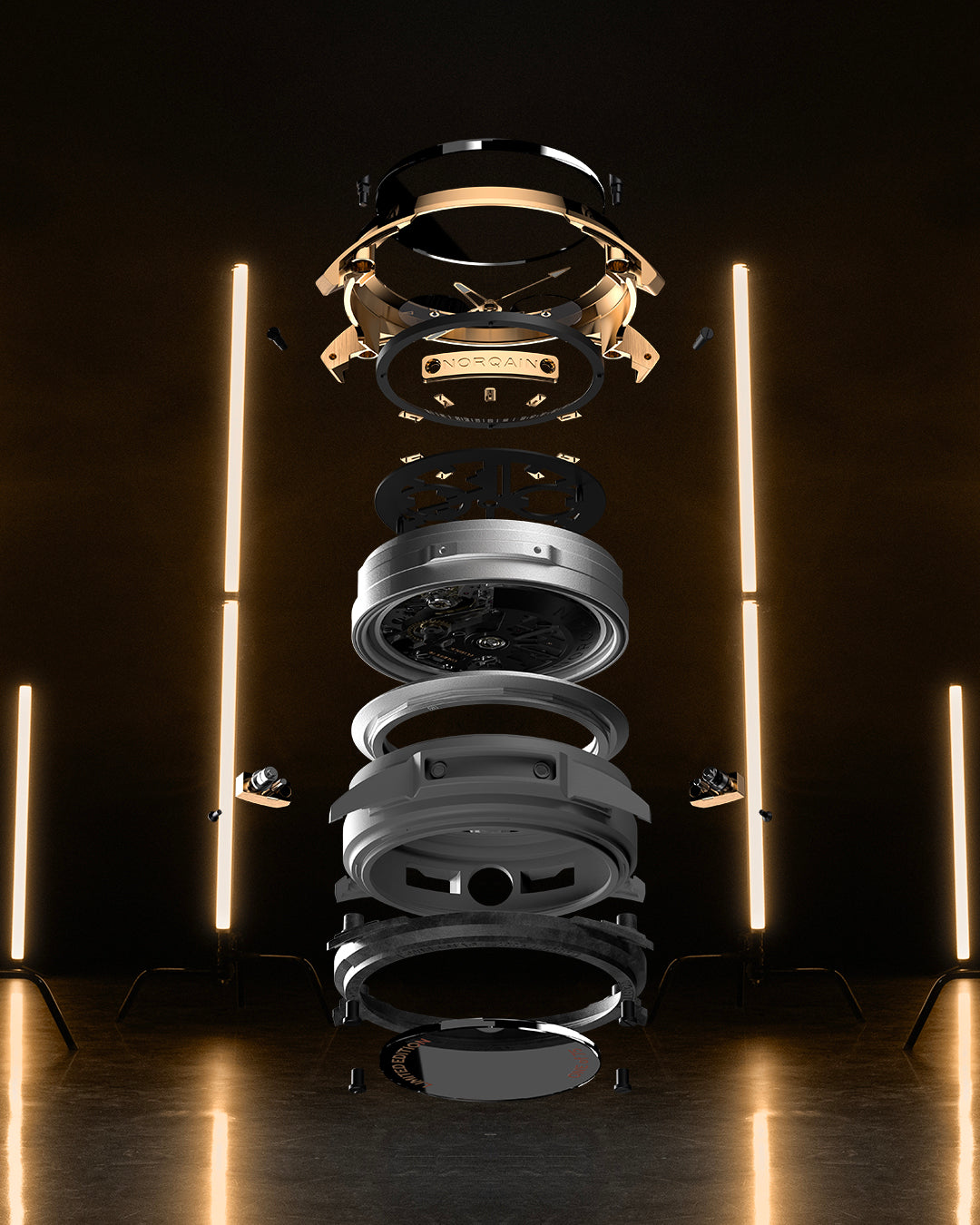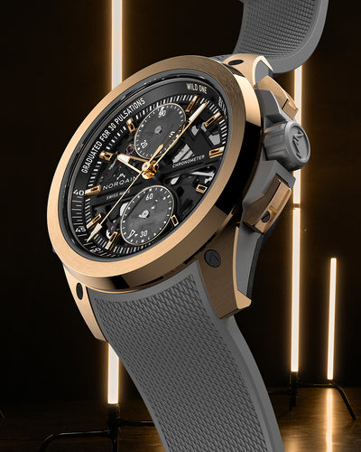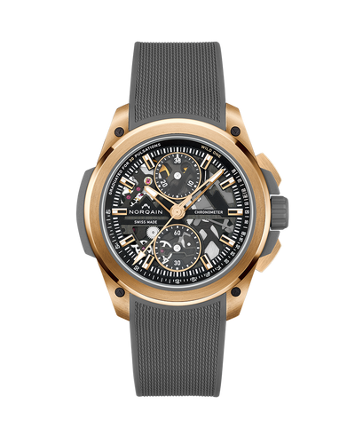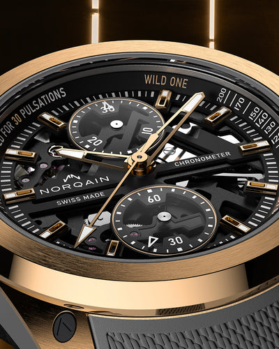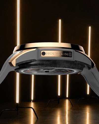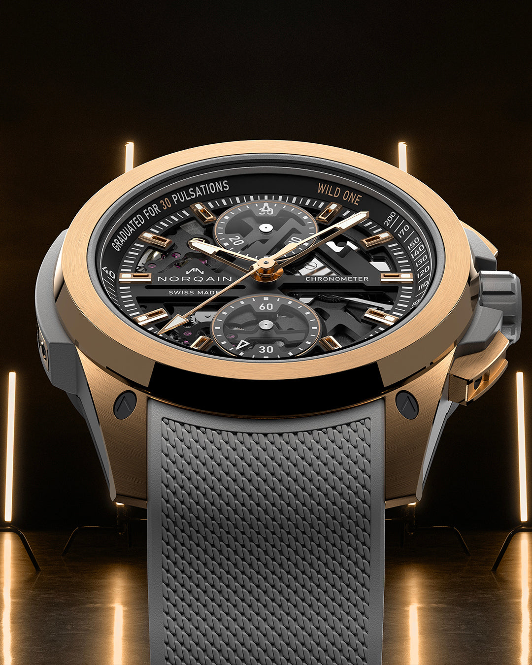 The top section of the watch’s revolutionary 42mm case design is cast in brushed and polished solid 18-carat red cold, while the base section is in grey NORTEQ®, a proprietary high-performance material exclusive to NORQAIN. These sections sandwich the Wild ONE’s signature rubber shock absorber to deliver a high-performance, shock resistant luxury sport watch.