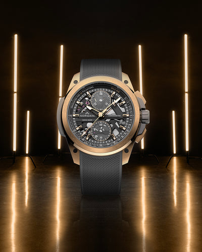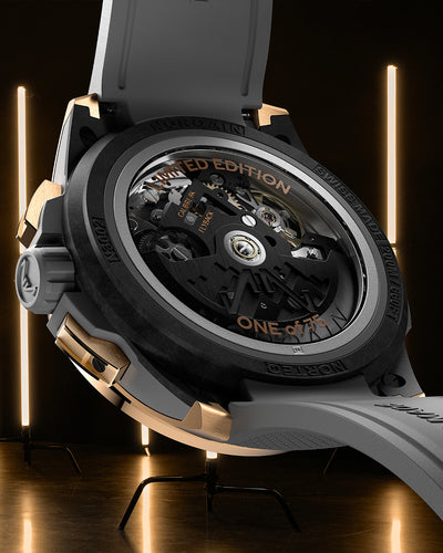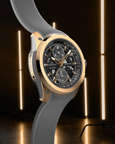 42mm 18k rose gold/Norteq case, Manufactured 8K Flyback chronograph in-house movement, skeleton dial with grey accents, grey rubber strap on deployant clasp. Limited 75 Pieces worldwide.